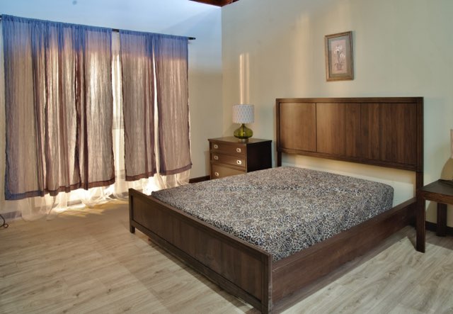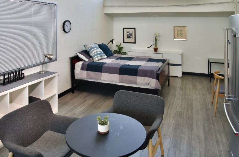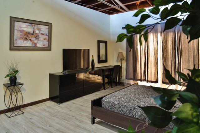 This modern bedroom has approximately 300+ square feet dressed with 2 full frame windows, curtains and sheers, a queen size modern bed set with mattress and bedding, 2 modern night stands with functional lamps, a dresser, and wood pattern linoleum floor. It’s ready to shoot.