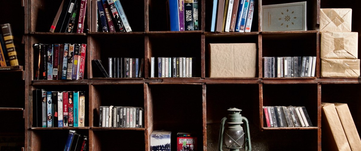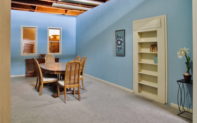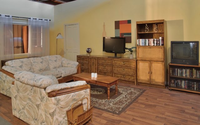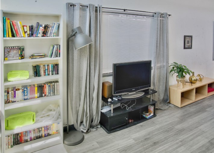 This living room has approximately 300+ square feet dressed with 1 full frame window, curtains and sheers, two bookshelves filled with books and movie tapes, three tables, lockers, wood pattern linoleum floor and a mid-century look rug. It’s ready to shoot.
