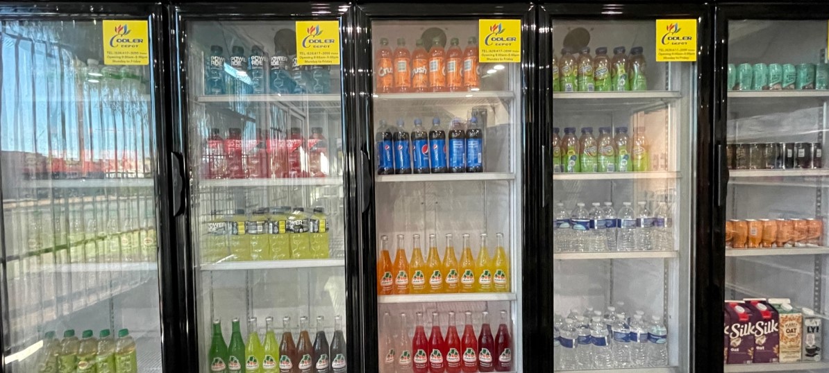 This Grocery Store / Convenience Store has approximately 300 square feet with gray color modern style. It features 2 units of double side gondola shelves and 2 end units. There is another 2 units single side shelves on the wall. 6 brand new single door commercial refrigerators are easy to move around. There is also an ice cream display freezer and a reception desk with 2 cigarette cabinet walls.