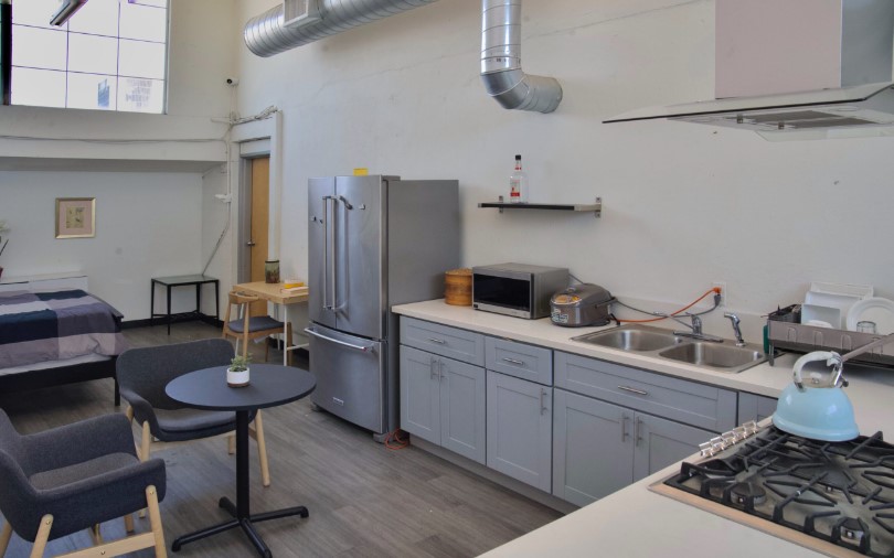This modern kitchen is fully functional. Approximately 500 square feet dressed with two full frame windows, and another two full frame windows on the top. It has a set of kitchen drawer with a sink with function of water, a range hood, and a set of gas stoves. A microwave is included. There are lights hanged on the ceiling that will help. Everything is functional and brand new!